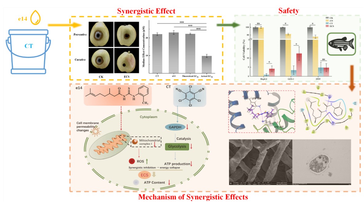 Colletotrichum fructicola是引起果蔬、茶叶等多种经济作物炭疽病的病原真菌,对农业生产效率与农产品品质构成严重威胁。百菌清作为一种广泛应用的保护性杀菌剂,长期单一使用可能引发抗药性风险。为应对该问题,本研究成功筛选出一种源自天然产物的柠檬醛酰基硫脲衍生物e14,可作为高效增效剂显著增强百菌清对C. fructicola的抑制活性,其增效系数达2.30,表明在维持相同防治效果的前提下,能够有效减少百菌清的施用剂量。机制研究表明,e14可特异性靶向病原菌线粒体复合物I,干扰氧化磷酸化过程,导致能量代谢障碍并诱发氧化应激反应。由于该作用机制与百菌清不同,二者联用可最大限度降低交叉抗性的发生风险,为抗性管理提供了创新策略。此外,该增效剂对哺乳动物细胞毒性较低,表现出良好的环境安全性。本研究系统揭示了e14的协同增效作用机制,为开发具有新颖作用方式、高效且低毒的绿色农药制剂提供了重要的理论基础与实践指导,对推动农业可持续发展具有重要意义。